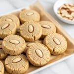 A close-up of a tray full of round, golden-brown cookies with a slightly rough texture and a single almond slice pressed into the center of each cookie. The cookies are piled on top of each other on light brown parchment paper that lines the white tray. In the background, there is a white dish with more almond slices to the right. The scene is set on a white marbled surface. photo taken with an iphone --ar 4:5 --v 7