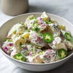 A zesty and creamy spicy jalapeno potato salad featuring tender boiled potatoes tossed in a flavorful mayonnaise and sour cream dressing with fresh jalapenos, red onion, cilantro, and lemon juice, perfect as a side dish for summer picnics or grilled meals.