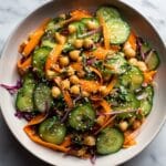 A vibrant and refreshing Asian-inspired slaw featuring crisp shredded cucumbers and carrots, protein-rich chickpeas, and a flavorful sesame dressing. This light, nutritious salad is quick to prepare, bursting with sweet, savory, and tangy notes, and perfect as a side dish, light lunch, or topping for grain bowls.