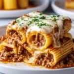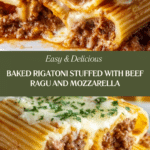 This hearty Baked Rigatoni Stuffed with Beef Ragu & Mozzarella combines tender rigatoni tubes filled with a rich, slow-simmered beef ragu, topped with a blend of melted mozzarella and Parmesan cheeses. Perfectly baked to a golden, bubbly finish, this comforting Italian-inspired dish is ideal for family dinners or special occasions.