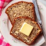 Two slices of brown banana nut bread with visible pieces of walnuts inside are placed on a white plate with a subtle floral pattern. The top slice has a melting square of pale yellow butter on its surface, creating a smooth contrast with the bread's textured crumb. A silver knife rests near the edge of the plate, and a red and white checkered cloth is partially visible in the top left corner. The background is a white marbled texture. photo taken with an iphone --ar 4:5 --v 7