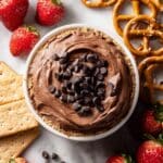 4. Serve: Once the dip is smooth, scrape it into a serving bowl. Top with mini chocolate chips for an extra chocolatey touch. Serve immediately with dippers such as graham crackers, cookies, or fruit.