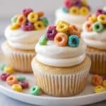 Keywords: cereal milk cupcakes, cereal milk buttercream, Fruit Loops cupcakes, nostalgic cupcakes, funfetti style cupcakes, colorful frosting, kids cupcakes, homemade cupcakes
