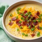 6. Serve with Toppings: Ladle the soup into bowls and garnish generously with the crumbled bacon, sliced green onions, and additional shredded cheddar cheese to replicate the full loaded baked potato experience. Enjoy warm.