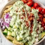 - Combine Ingredients: In a large bowl, combine shredded chicken, cooked pasta, chopped bacon, halved cherry tomatoes, diced cucumber, sliced red onions, diced avocado, and the homemade ranch dressing. Mix everything well so the salad is evenly coated with the dressing. Adjust the amount of dressing to your taste preference.