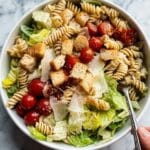- Combine salad ingredients: In a large bowl, mix the cooled pasta, cooked chicken, crispy bacon, shredded parmesan, salad supreme seasoning, Caesar dressing, and ranch dressing. Avoid adding romaine lettuce and croutons to the whole salad if planning leftovers as lettuce wilts and croutons become soggy over time.