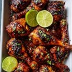 A white rectangular tray holds a pile of grilled chicken drumsticks and thighs coated in a shiny, dark reddish-brown sauce with charred spots. The chicken pieces are arranged close together, covered with small green cilantro leaves scattered over the top. Two lime halves, fresh and bright green, are placed on the top left and bottom right corners of the tray, adding a pop of color. The entire tray sits on a white marbled surface, showing some sauce pooling at the bottom. photo taken with an iphone --ar 4:5 --v 7