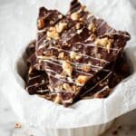 A white bowl lined with crinkled white paper holds several pieces of chocolate bark. Each piece is a single thick layer of glossy dark brown chocolate topped with small crushed tan nuts and drizzled with thin white chocolate lines. The bark pieces are irregular in shape with crunchy textures from the nut pieces on top. Some crumbs of chocolate and nuts are scattered loosely around the bowl on a white marbled surface. photo taken with an iphone --ar 4:5 --v 7