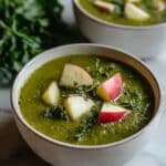 A white bowl holds a thick, green soup with a smooth but slightly textured surface, topped with several chunky pieces of apple showing red skin and pale flesh, and small sprigs of fresh green herbs carefully scattered on top. The bowl is placed on a white marbled surface, with some fresh green herbs blurred in the background and a second similar bowl partially visible behind the first. photo taken with an iphone --ar 4:5 --v 7