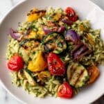 Keywords: creamy pesto orzo, roasted vegetables, easy pasta recipe, vegetarian dinner, Italian pasta dish, comfort food, weeknight meal