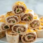 These Cuban Sausage Pinwheels are a deliciously savory appetizer featuring seasoned ground sausage, creamy cheese, crispy bacon, and tangy pickles all rolled up in soft flour tortillas. Perfect for parties or a tasty snack, they combine bold Cuban-inspired flavors with a creamy, cheesy texture that’s sure to please any crowd.