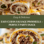 Keywords: Cuban sausage pinwheels, sausage appetizer, party snack, Cuban cuisine, cheesy pinwheels, bacon pinwheels
