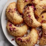 The image shows a close view of multiple crescent-shaped pastries arranged on a white plate, each pastry has a golden brown, shiny surface with a smooth texture, and is coated on one side with light brown crushed nuts, adding a crunchy texture. Some pastries are sprinkled with tiny pink rose petal flakes that contrast with the golden color. The pastries are stacked closely, filling the plate completely with no visible gaps. The background features a white marbled texture. photo taken with an iphone --ar 4:5 --v 7
