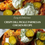 This Dill Pickle Parmesan Chicken recipe offers a flavorful, crispy chicken dish combining tangy dill pickle juice marinade with a crunchy Parmesan and potato chip crust. Baked to golden perfection and served with a creamy dill sauce, it’s a unique twist on breaded chicken that’s sure to delight pickle lovers and those seeking a zesty, savory meal.