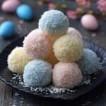 A black leaf-shaped plate is filled with a pyramid of round, pastel-colored coconut-covered balls. The balls come in soft pink, light blue, and pale yellow colors, each coated evenly with white shredded coconut, giving a textured look. The plate sits on a dark wooden surface with scattered coconut flakes around it, and soft-focus pastel-colored eggs and twigs appear in the background, adding a delicate touch to the scene. photo taken with an iphone --ar 4:5 --v 7