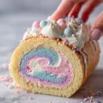 - Decorate (Optional): If desired, frost the outside of the cake roll with extra whipped frosting and sprinkle pastel sprinkles on top for an extra festive touch.