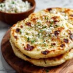 Two round flatbreads are stacked on a round wooden board, each with a golden color and browned spots from cooking. The flatbreads have small white crumbles of cheese spread across their surface and green herbs sprinkled on top, adding texture and contrast. The background shows a blurred wooden bowl with more white cheese crumbles inside, all set on a white marbled texture. photo taken with an iphone --ar 4:5 --v 7