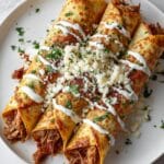 This easy 30-minute chicken chimichanga recipe features tender shredded chicken combined with Monterey Jack cheese, mild diced chiles, and a flavorful Mexican white sauce all rolled in flour tortillas, brushed with butter, and baked to golden perfection. Perfect for a weeknight dinner, these crispy baked chimichangas are delicious and satisfying without the heavy frying.