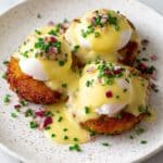 Easy Latke Eggs Benedict combines the crispy, golden goodness of potato latkes with silky poached eggs and rich hollandaise sauce, topped with smoky cold smoked salmon and fresh chives. This creative brunch twist on classic eggs benedict uses russet potatoes for the crispiest latkes, making it a perfect special occasion or weekend brunch dish that impresses with its texture contrast and decadent flavors.