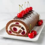 7. Garnish and Serve: Dust the top of the cake roll lightly with powdered sugar. Optionally, decorate with chocolate shavings and fresh cherries to enhance its elegance. Slice into portions and serve chilled for the best flavor and texture experience.