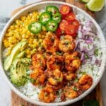 - Assemble the bowls: Top each bowl of rice with cooked shrimp, diced red onion, cherry tomatoes, fire roasted corn, sliced jalapeno (if using), avocado slices, and a sprinkle of fresh chopped cilantro. Add extra lime juice over the top if desired.