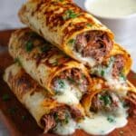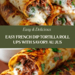 These French Dip Tortilla Roll Ups are a delicious twist on the classic sandwich, combining thinly sliced roast beef and melted mozzarella or provolone cheese wrapped in warm flour tortillas. Baked until golden and served with a savory homemade au jus dipping sauce, they make a perfect appetizer or easy dinner dish that’s ready in just 25 minutes.
