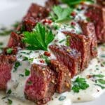- Serve and Garnish: Pour the warm garlic cream sauce over cooked steak and garnish with fresh chopped parsley before serving.