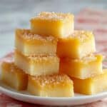 A stack of eight square lemon bars is arranged on a white plate, set on top of a white marbled surface with a soft, pink floral cloth underneath. Each bar has two layers: a shiny golden-brown top layer that looks slightly crisp and sparkling sugar granules sprinkled on it, and a thick, soft, pale yellow bottom layer with a moist texture. The bars are stacked in a pyramid shape, with four on the bottom, three above them, and one piece at the top, showing the smooth and clean edges of each bar. photo taken with an iphone --ar 4:5 --v 7