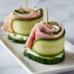 Keywords: cucumber rolls, cream cheese rolls, healthy snacks, low carb appetizer, deli meat roll-ups, easy party snacks, fresh cucumber snacks, quick no-cook recipe