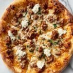 - Add Sausage and Feta: Evenly distribute the cooked, crumbled hot sausage over the cheese layer. Then sprinkle the crumbled feta cheese across the pizza for tangy, salty contrast. Optionally, add crushed red pepper flakes for more heat and sprinkle garlic and oregano for additional flavor.
