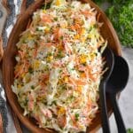 A wooden oval dish filled with a colorful salad made of thin white cabbage strips mixed with thin orange carrot strips and yellow corn kernels, topped with small black sesame seeds and chopped green parsley scattered evenly over the salad. Two black utensils rest on the right side of the dish, placed on a white marbled surface with some fresh parsley sprigs nearby and a folded striped cloth on the left. The salad layers show a creamy texture mixed with crispy vegetables, creating a fresh and vibrant look. Photo taken with an iphone --ar 4:5 --v 7