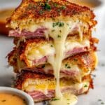 The image shows a close-up of a stack of four golden brown, crispy rolled sandwiches filled with layers of melted pale yellow cheese and thin slices of pink cured meat, with some cheese stretching and dripping out softly. The rolls have finely chopped green herbs sprinkled on top. A white bowl of light orange dipping sauce is placed in the background on a white marbled surface. The textures of the crispy outer layer and gooey melted cheese are clearly visible, making the dish look warm and tasty. Photo taken with an iphone --ar 4:5 --v 7
