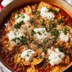 This Lasagna Soup is a hearty and comforting one-pot meal that brings all the flavors of classic lasagna into a warm, cozy soup. Made with ground beef, aromatic herbs, tomatoes, and broken lasagna noodles, it’s topped with creamy ricotta, melted mozzarella, and parmesan cheese, making it perfect for a satisfying weeknight dinner.