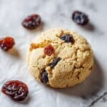 A close-up view of a soft round cookie with a golden-brown top, slightly cracked surface, and visible dark dried fruit pieces embedded inside. The cookie rests on white parchment paper placed over a white marbled texture. Near the cookie, there are three dark dried fruits scattered for decoration. The background is bright and clean, focusing on the cookie's texture and color. photo taken with an iphone --ar 4:5 --v 7