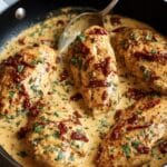Marry Me Chicken is a creamy, flavorful skillet dish featuring seared boneless chicken breasts simmered in a rich sauce made with sun-dried tomatoes, garlic, heavy cream, and Parmesan cheese. This comforting meal combines Italian seasonings and fresh herbs for an irresistible dinner that’s simple to prepare in just 35 minutes.