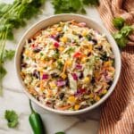 - Add vegetables and mix: Add the tri-color coleslaw mix, diced red bell pepper, drained Rotel diced tomatoes and green chilies, drained corn kernels, rinsed black beans, finely chopped jalapeno, and chopped fresh cilantro to the bowl with the dressing.