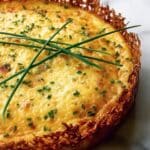 A round, golden-brown quiche with a crispy, textured crust that looks like it's made from shredded potatoes, forming a thick, crunchy edge all around. Inside, there is a smooth, creamy yellow egg layer dotted with small green chive pieces and tiny browned bits, likely bacon or ham. On top of the quiche are several long green chive strands arranged in a loose cross pattern. The quiche sits on a white plate on a white marbled texture surface. photo taken with an iphone --ar 4:5 --v 7
