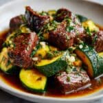 This one-pan garlic butter steak and zucchini recipe offers a quick and flavorful meal perfect for busy weeknights. Tender sirloin or ribeye steak cubes are seared to perfection, then combined with sautéed zucchini and a fragrant garlic butter sauce infused with fresh parsley, thyme, and a hint of red pepper flakes. Ready in just 35 minutes, this dish delivers rich, savory flavors with minimal cleanup.