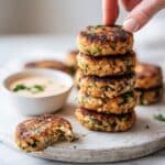 The image shows a stack of golden-brown patties with a crispy, slightly charred surface and visible green herbs mixed inside. There are about six patties piled loosely on a round white wooden plate, with one patty tilted to reveal its texture. In the background, a small white bowl contains a pale creamy sauce with green flecks, placed on a white marbled surface. A woman's hand is gently holding one patty from the stack. Photo taken with an iphone --ar 4:5 --v 7