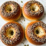 Four golden-brown bagels are placed close together on a white marbled surface. Each bagel has a shiny, slightly crispy outer layer covered in a thick topping of mixed seeds, including black sesame seeds, white sesame seeds, poppy seeds, and bits of salt, creating a textured look. The bagels are round with a hole in the middle, showing a dense, soft inside. There are some scattered seeds on the surface around the bagels, adding a natural touch to the arrangement. photo taken with an iphone --ar 4:5 --v 7