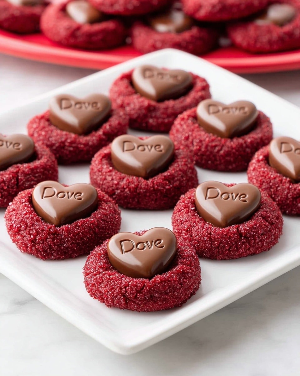 Delight in these festive Red Velvet Blossom Cookies, featuring a tender red velvet dough rolled in colorful sugar and crowned with a luscious Dove Chocolate Heart. Perfect for celebrations or a special treat, these cookies combine classic flavors with a charming presentation.