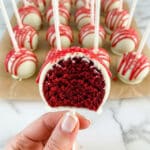 Keywords: red velvet cake balls, cake pops, white chocolate dipped, party treats, cream cheese frosting, homemade desserts