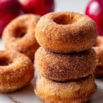 A close-up of five small cinnamon sugar-coated donuts stacked together on a white marbled surface, each donut showing a thick even layer of cinnamon sugar giving a slightly grainy texture with a golden brown color. The donuts have a soft, slightly puffy look with a round hole in the center. In the blurred background, there are two whole red apples with shiny skins adding a pop of color behind the warm-toned donuts. photo taken with an iphone --ar 4:5 --v 7