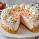 Keywords: Strawberry cheesecake, no-bake cheesecake, summer dessert, creamy cheesecake, cookie crust, gelatin swirl, crunchy topping