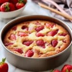 A round, golden brown cake in a silver baking pan sits on a white marbled surface. The cake has a textured top with baked uneven edges and is studded with fresh, bright red strawberry pieces that are partially sunk into the light yellow cake batter. Each strawberry piece shows its juicy inner flesh and vibrant seeds, contrasting with the soft, crumbly cake layer. To the left, a white bowl with whole strawberries is partly visible, adding to the fresh feel. A gray cloth and pink-toned chopsticks lie blurred in the background. photo taken with an iphone --ar 4:5 --v 7