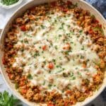 This Stuffed Pepper Casserole recipe is a comforting, all-in-one skillet meal featuring ground Italian sausage, bell peppers, onions, and aromatic spices simmered with rice in a flavorful tomato salsa and chicken broth mixture. Topped with melted mozzarella cheese, it’s a delicious and easy-to-make dish that captures the classic flavors of stuffed peppers without the fuss of coring and stuffing individual peppers.