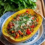 This Stuffed Spaghetti Squash recipe features roasted spaghetti squash filled with a savory ground lamb and tomato mixture, enhanced with fresh herbs, Kalamata olives, and creamy feta cheese. A flavorful, hearty dish perfect for a satisfying family meal.
