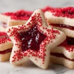 Delight in these festive Sugar Plum Star Shortbread Cookies featuring a buttery, spiced dough with hints of orange zest and warm spices, topped with a luscious layer of raspberry or sugar plum jam and a sprinkle of coarse sugar. Perfect for holiday celebrations or as a charming treat any time of year.