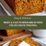 Keywords: pumpkin bread, pumpkin bread recipe, easy pumpkin bread, moist pumpkin bread, sweet pumpkin bread, cream cheese frosting, autumn dessert, spiced bread