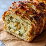 This swirled garlic herb and cheese bread is a warm, flavorful loaf featuring a soft, pillowy texture infused with aromatic garlic, dried herbs, and a gooey combination of mozzarella and Parmesan cheeses. Perfect for family gatherings or cozy nights, this bread offers a deliciously cheesy and herby experience that is easy to make and sure to impress.